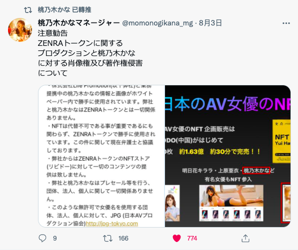 有多疯?基本上厂商是拿着大把钞票在日本找人,女优只要twitter追踪数破十万都有机会做NFT商品。也因为NFT太热所以出现两种怪现象,一个是出现盗版业者,前阵子大家应该还记得桃乃木かな(桃乃木香奈)在twitter发文要大家注意别买到盗版的NFT(有趣的是NFT本来就是为了防止盗版而生),再来,NFT热斗的状况好像是见者有份,就连松本いちか(松本一香)都有ー