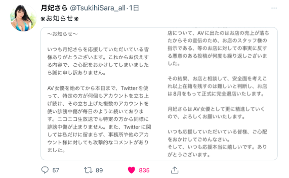 昨天,在片商Oppai出道、号称出道前在风俗界横着走的月妃さら(月妃纱罗)就公开发表了退职宣言,不是不做女优了,而是离开了风俗界,这本来没什么好张扬的,不过看了公告内容才知道她是被网路上各种毁谤中伤的留言吓坏,基于人身安全的考量所以选择离职,未来就专心做好AV女优的工作⋯