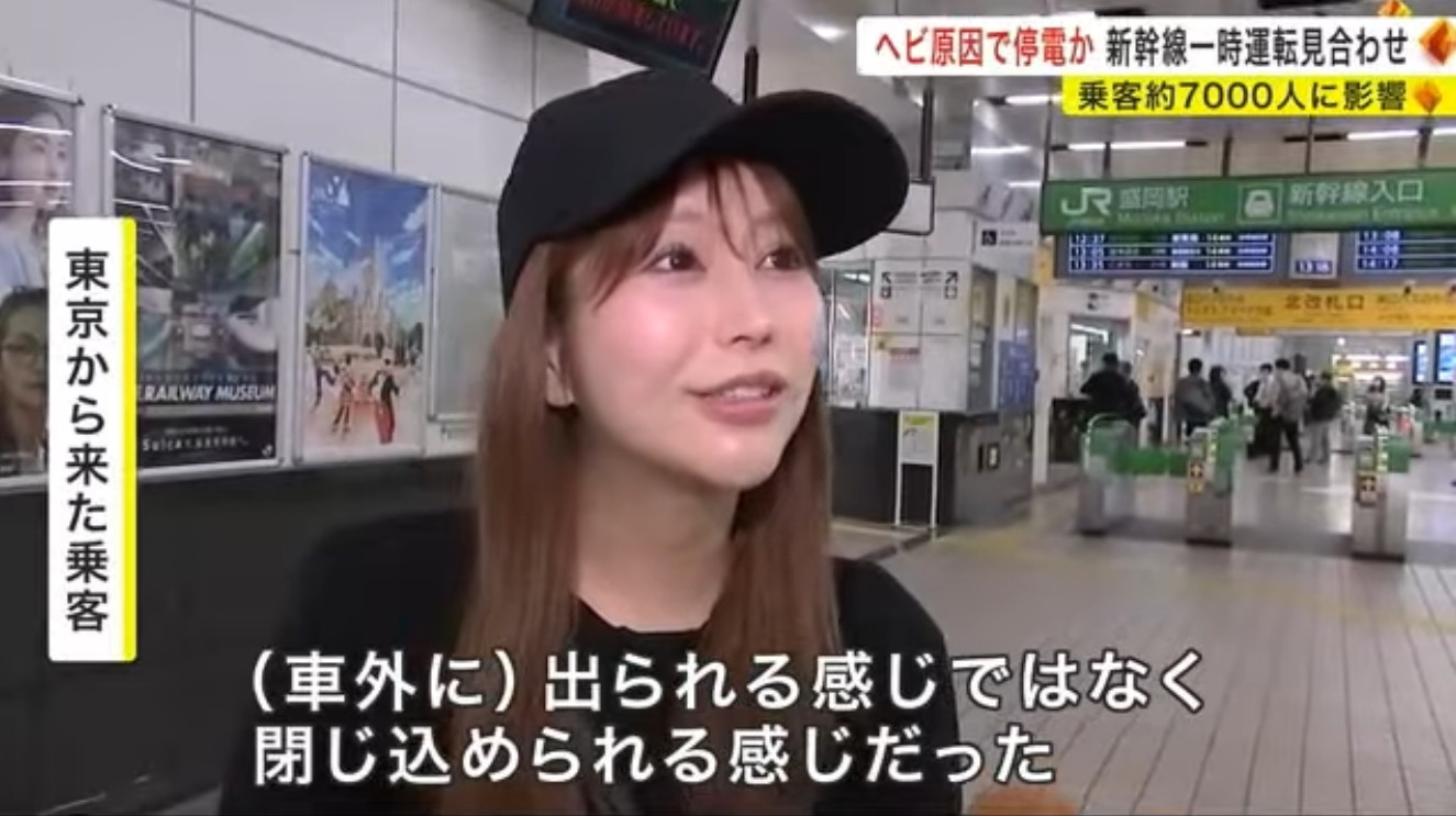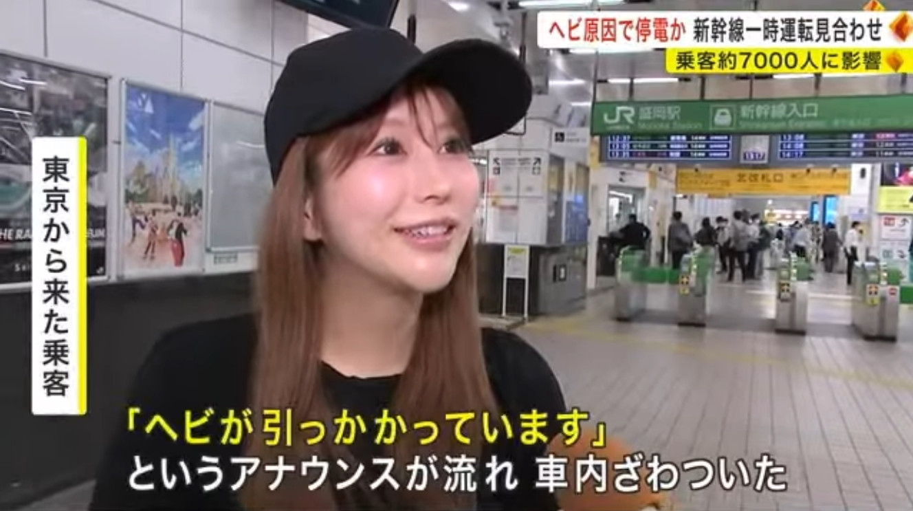 这样的她为什么可以上电视?因为日本的东北新干线在前天(5/17)中午11点的时候停电两小时,到了下午一点才恢复通车,JR东日本的工作人员到了现场发现是因为蛇触电导致运输停摆,排除后恢复通车〜