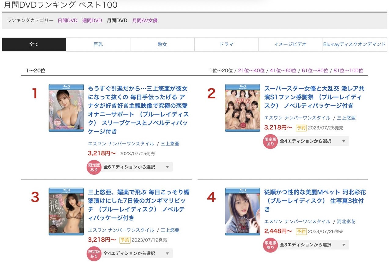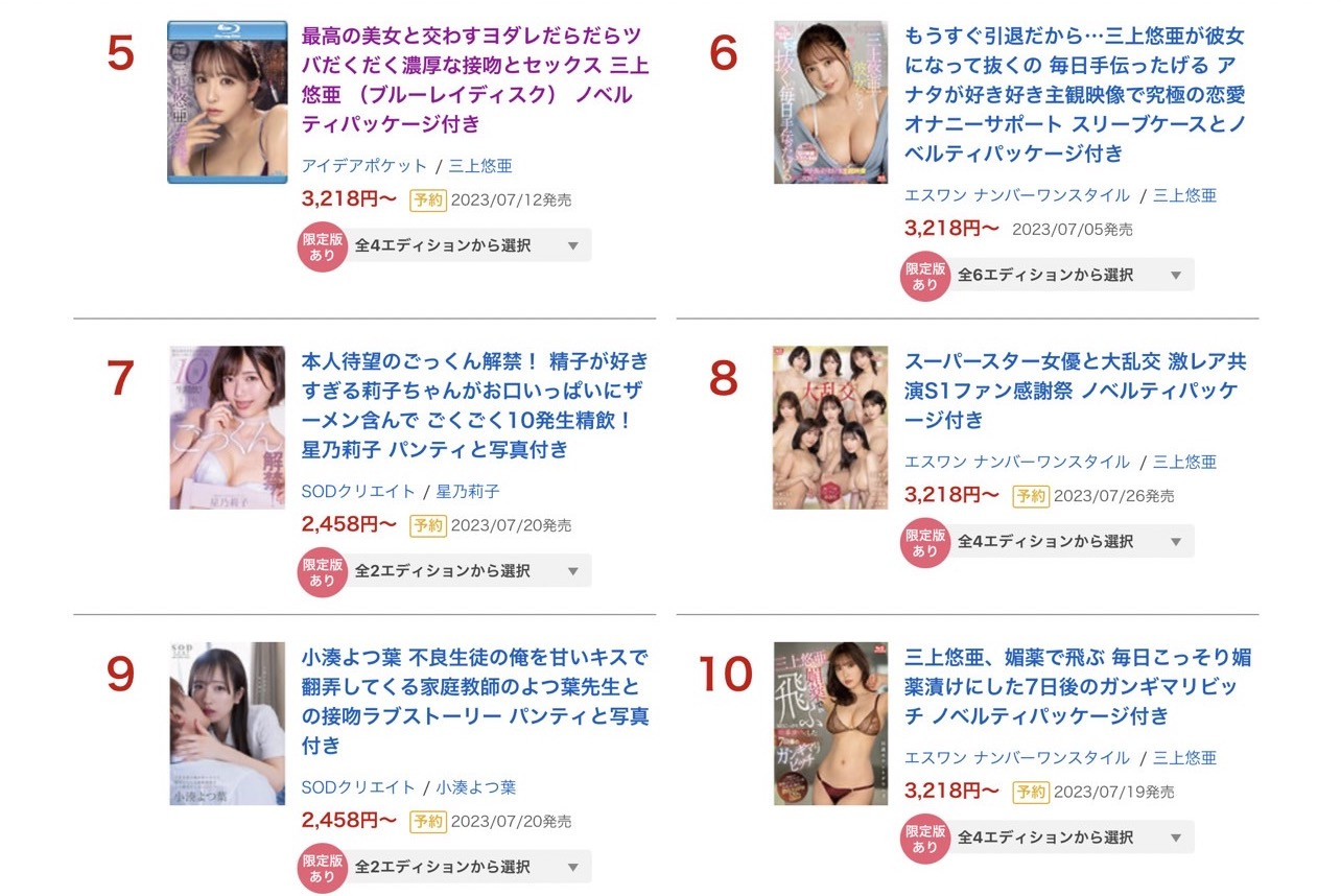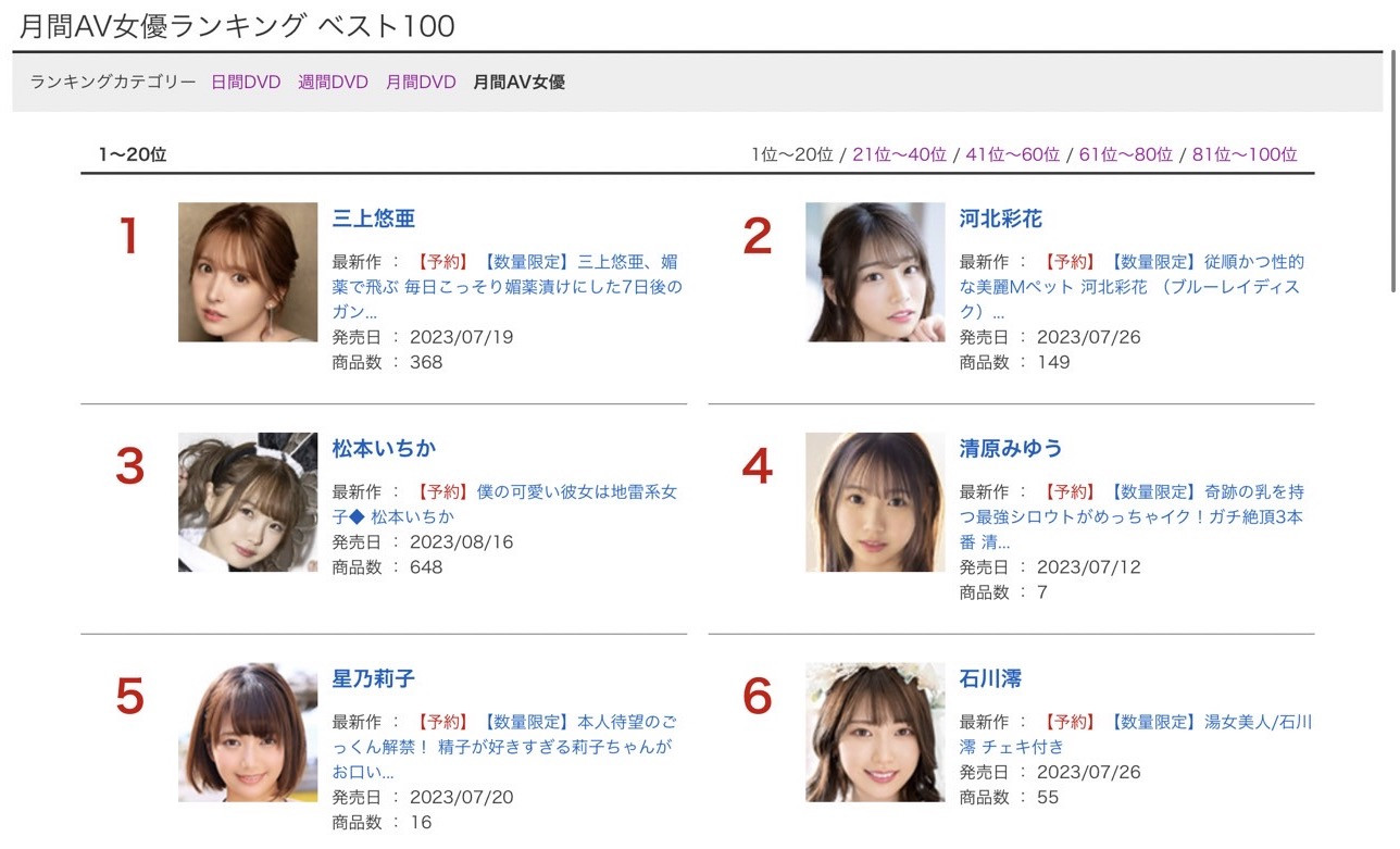 三上悠亜有多夸张?前6名有5支她的作品(5支个人演出+1支共演),前10名有7支她的作品,其他女优不要说和她竞争了,要不是河北彩花靠着绑上项圈的Mペット(抖M宠物)企划拿下第二名,只怕三上会让大家只能去争第6名以后的名次〜