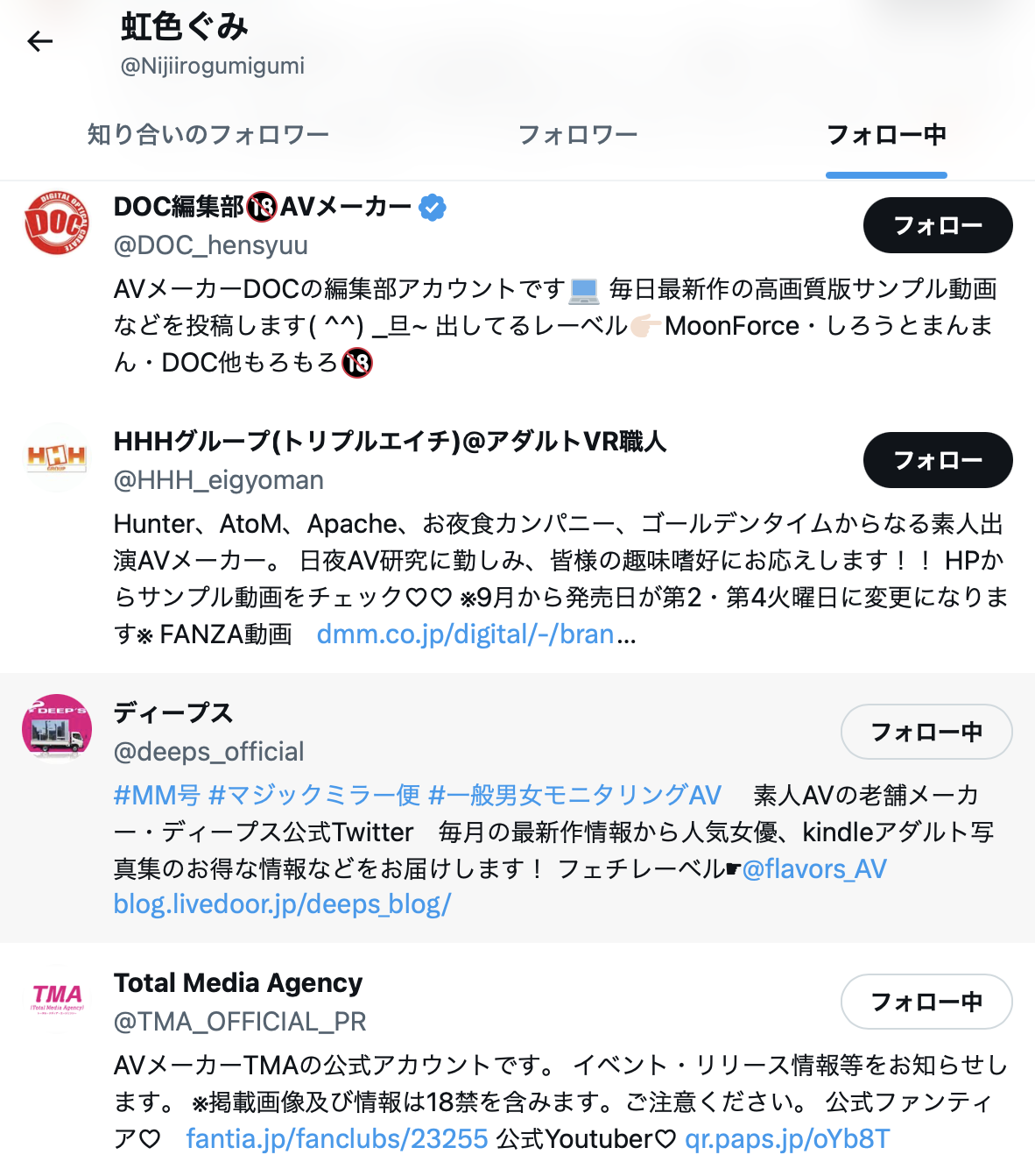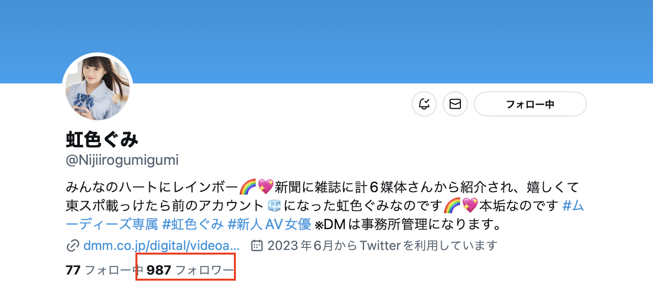 因为她存在感真的太低了,到现在twitter(就X)还不满千人追踪,以顶尖片商的专属女优而言实在太边缘了,现在她又完成了6支作品的发片门槛,然后各位可以去看看她twitter(X)追踪的名单: