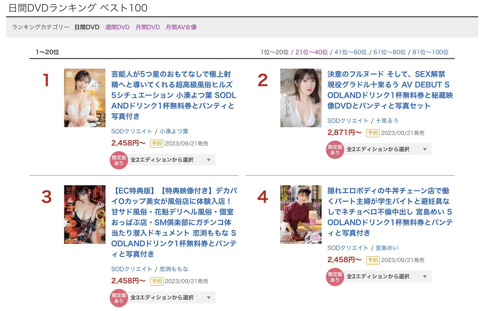 这是昨天FANZA(DMM)的单日销售排行榜。
