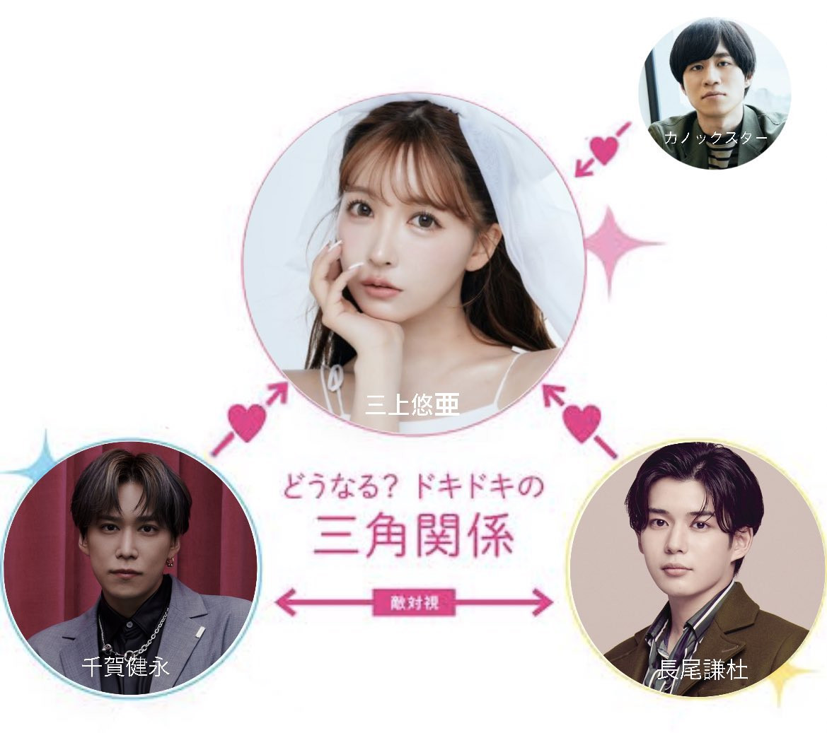 这边有把三上和两位偶像的关系讲清楚,千贺是前男友,和三上关系还是不错,长尾则是热烈追求三上中